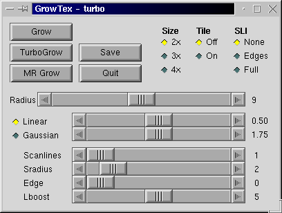 GrowTex Linux version 000717-2340 Linear TurboGrow radius=8, Lparam=0.50 size=4x, tile=off, SLI=N/A scanlines=1, sradius=2 edge=N/A, lboost=N/A Synthesis time: 73s |